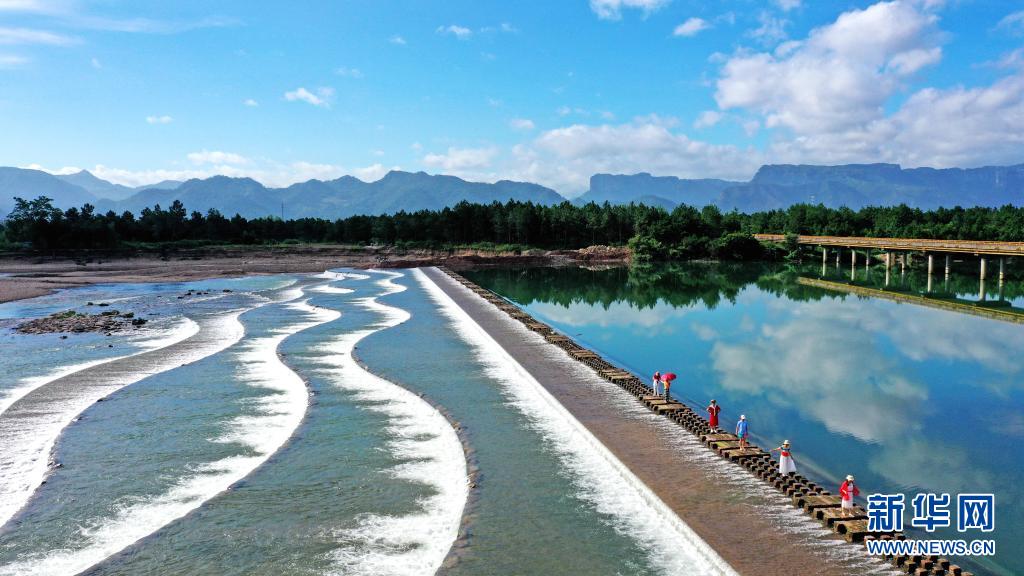 7月6日,市民在浙江省臺州市仙居縣永安溪白塔鎮(zhèn)段游玩(無人機照片)。