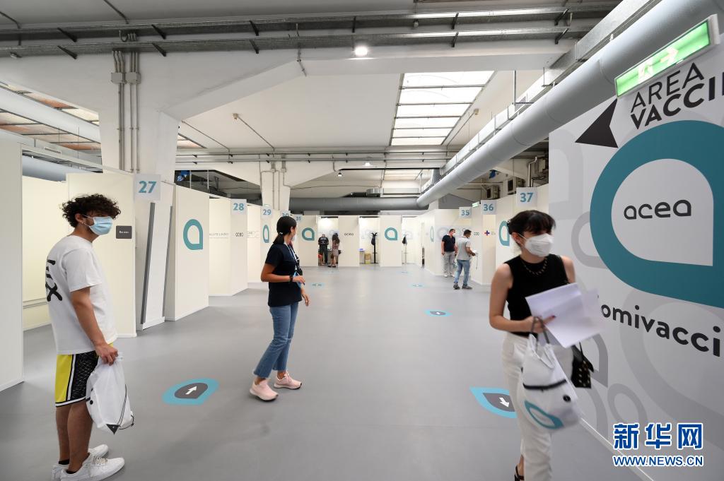 7月6日,人們在意大利羅馬一處新冠疫苗接種點等待接種疫苗。