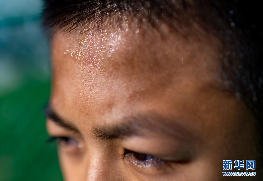 塔城市第二小學(xué)曲棍球隊(duì)的一名小隊(duì)員在訓(xùn)練間隙休息(6月11日攝)。