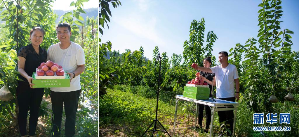 拼版照片:左圖為在山西省吉縣,武偉和妻子梁雪雪展示吉縣蘋果;右圖為武偉和妻子梁雪雪通過網絡直播銷售蘋果(7月9日攝)。今年30歲的武偉是山西省洪洞縣武家莊村人,2009年大學畢業后,他開過快遞公司,也做過微商。期間,他看到來自家鄉的蘋果存在質高價低、銷售不暢的情況,于是開始通過電商銷售優質蘋果。今年以來,武偉和妻子趁著農閑嘗試直播帶貨,沒想到短短數月粉絲量就已過萬。目前,只要天氣允許,他們每天都會直播兩場,日銷售蘋果500余單。