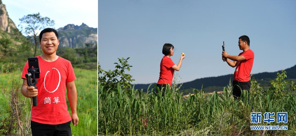 拼版照片:左圖為劉瑞旭拿著手機穩(wěn)定器;右圖為在山西省黎城縣巖井村,劉瑞旭(右)和合作社同事在谷子地里直播(7月8日攝)。今年29歲的劉瑞旭開過飯店、賣過房子、種過果樹,2019年回到老家平順縣榔樹園村做起了職業(yè)農(nóng)民,成為太行山上的“新農(nóng)人”。回村后,劉瑞旭和合作社的同事抓住網(wǎng)絡直播帶貨的熱潮,嘗試田間地頭直播。借助網(wǎng)絡的力量,合作社的小米搭上了“互聯(lián)網(wǎng)+”快車銷往全國各地。