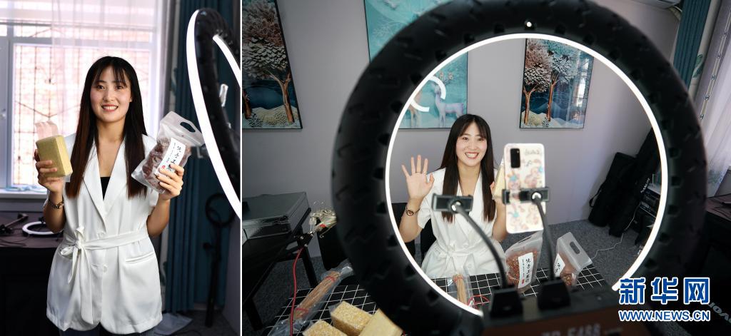 拼版照片:左圖為何雪艷在山西省平順縣龍鎮村電商服務中心直播間里;右圖為何雪艷通過網絡直播介紹農產品(7月8日攝)。今年25歲的何雪艷是龍鎮村電商服務中心的網絡主播,從一個“電商小白”變身網絡主播不到一年時間,何雪艷已成為龍鎮村帶貨能力頗強的“網紅”。從最初直播時結結巴巴,到如今精準掌握網絡語言,何雪艷和村里其他主播變得越來越熟練。