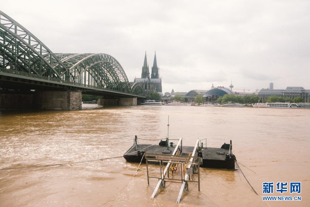 這是7月15日在德國西部城市科隆拍攝的水位上漲的萊茵河。