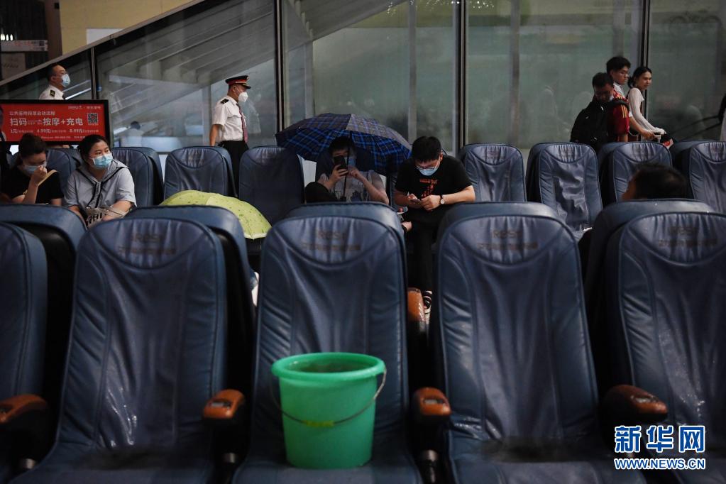 7月20日,旅客滯留在鄭州東站。候車廳出現(xiàn)漏雨情況,旅客撐傘擋雨。