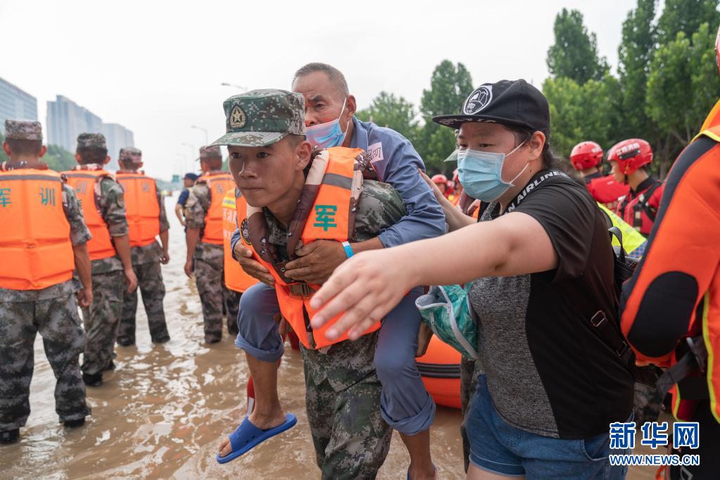 7月22日,在阜外華中心血管病醫(yī)院附近的錦繡路與鄭開大道交叉口,救援人員轉(zhuǎn)移病患。