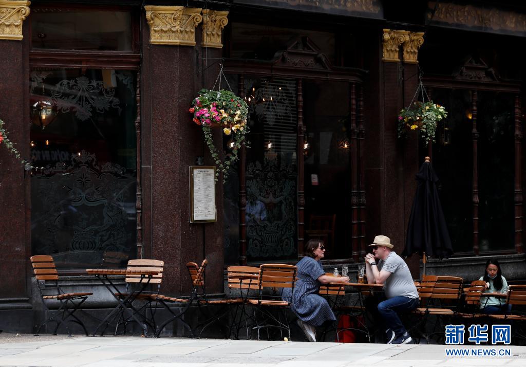 7月26日,人們坐在英國倫敦市中心一家酒吧的戶外餐飲區。