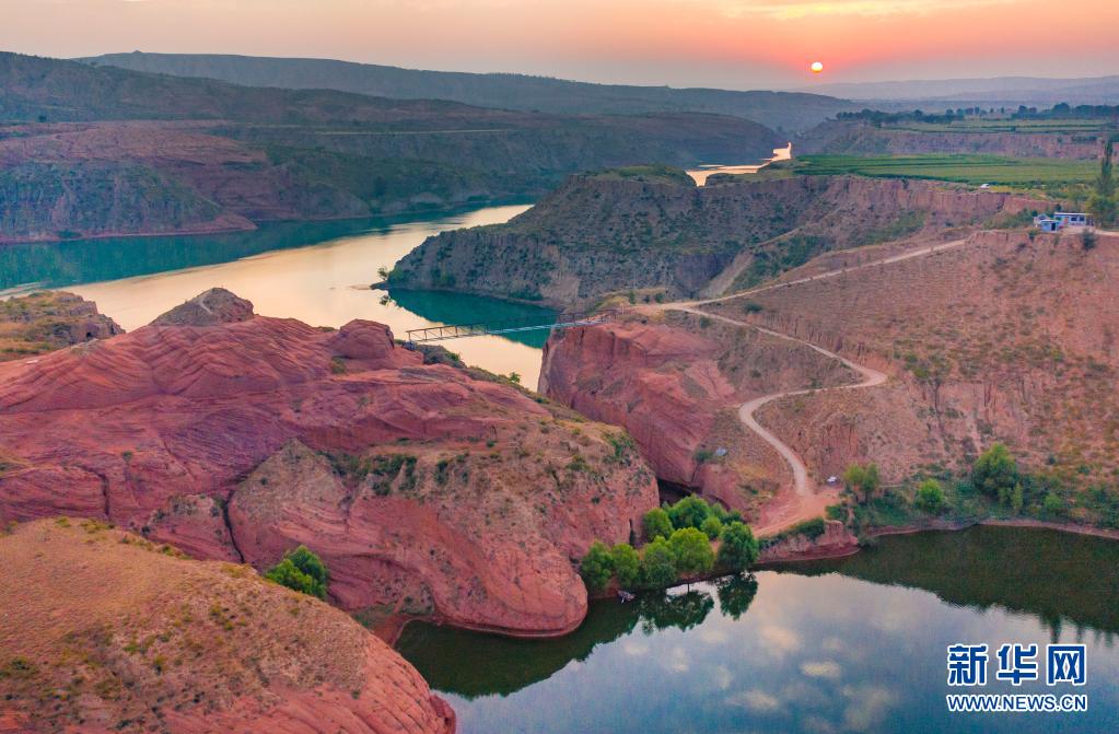 8月6日,朝霞映照下的靖邊縣龍洲鎮波浪谷丹霞景區(無人機照片)。