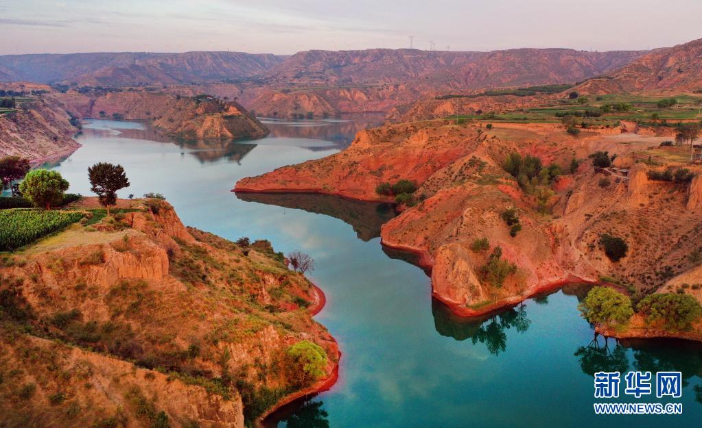 8月6日,朝霞映照下的靖邊縣龍洲鎮波浪谷丹霞景區(無人機照片)。