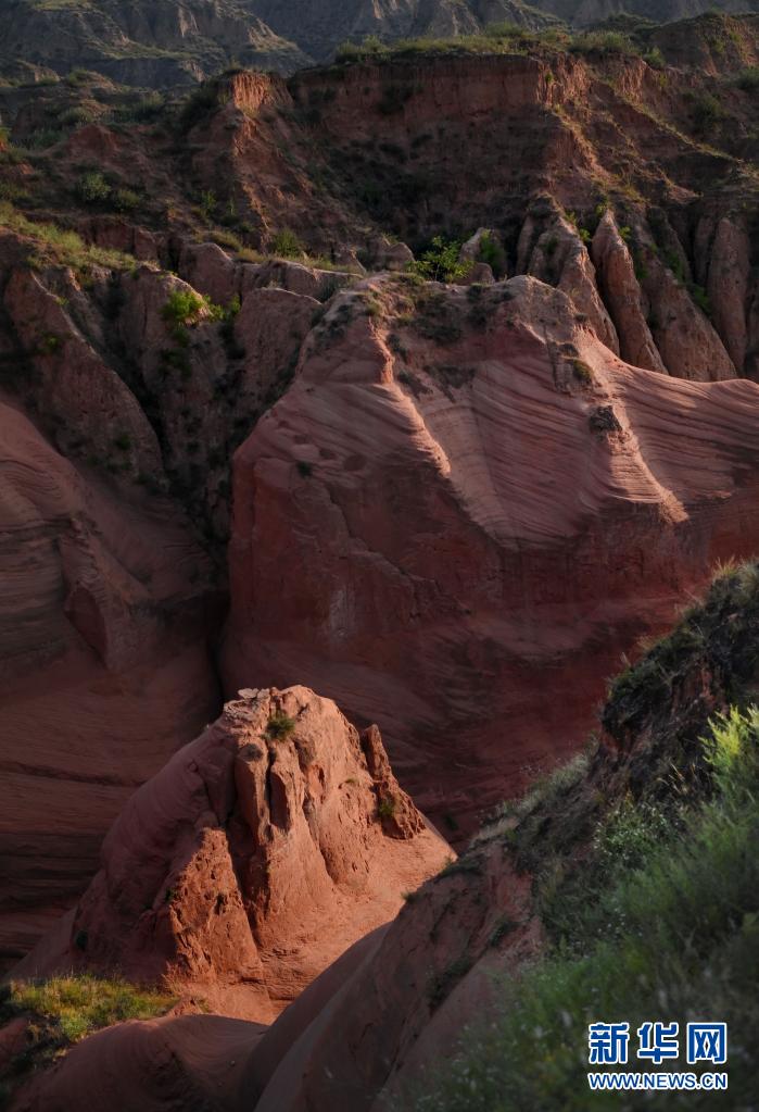 8月6日,朝霞映照下的靖邊縣龍洲鎮波浪谷丹霞景區。