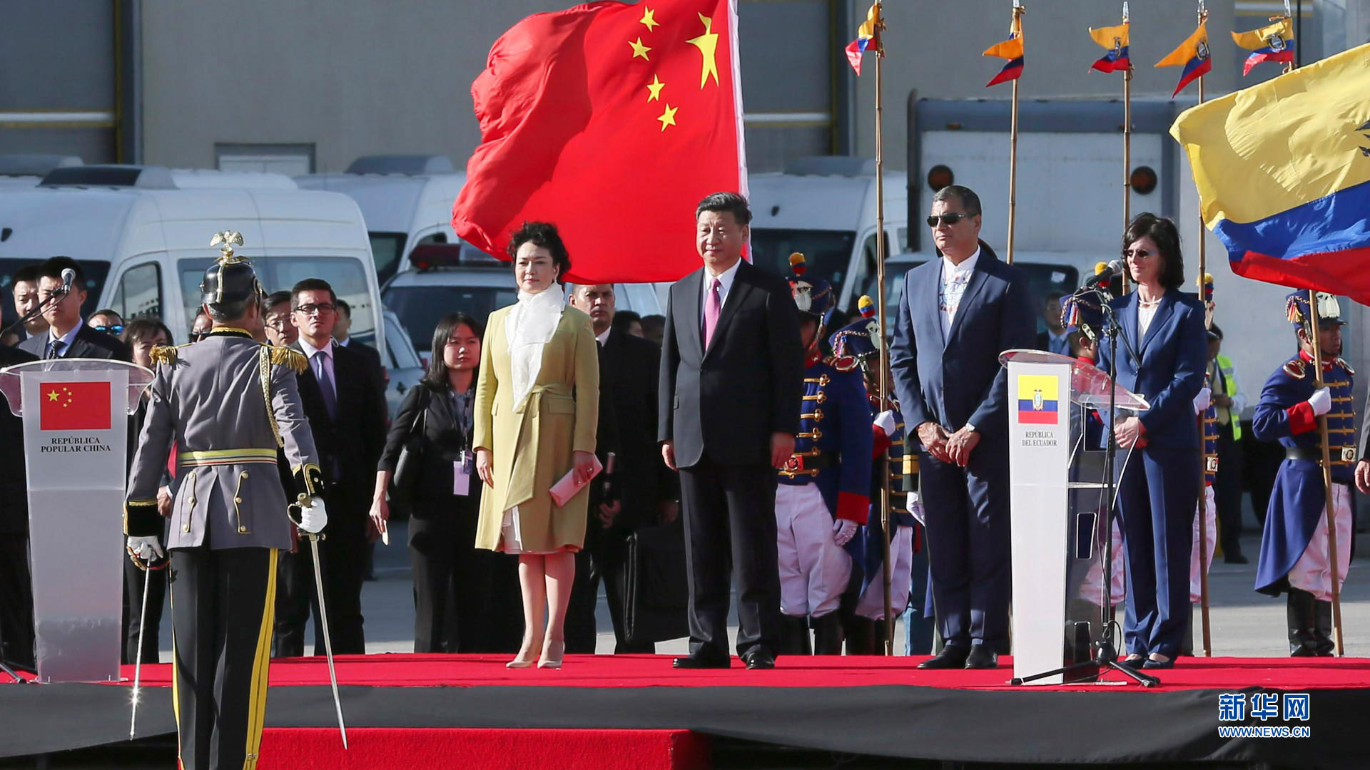 當地時間11月17日,國家主席習近平乘專機抵達基多,開始對厄瓜多爾共和國進行國事訪問。這是厄瓜多爾總統科雷亞在機場為習近平舉行隆重歡迎儀式。新華社記者 鞠鵬 攝2016-11-18