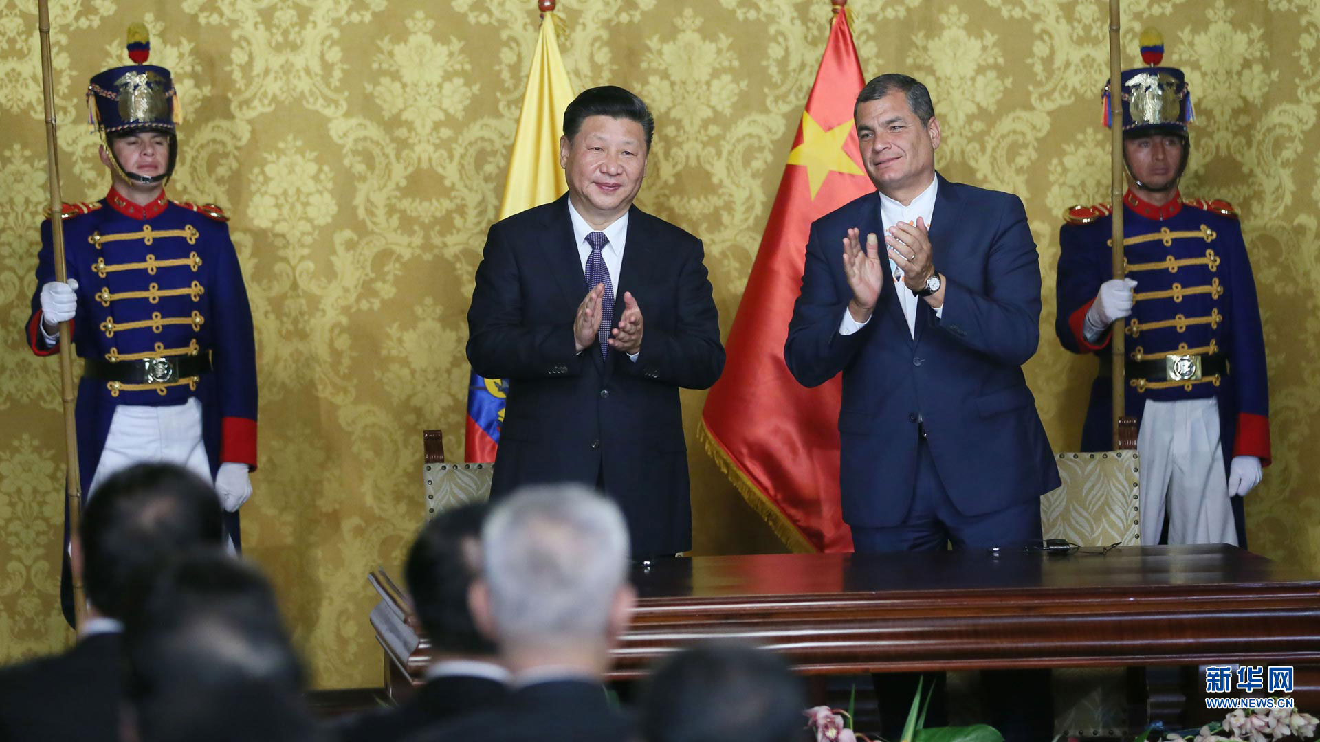 當地時間11月17日,國家主席習近平在基多同厄瓜多爾總統科雷亞舉行會談。這是會談后,兩國元首見證雙邊合作文件的簽署。 新華社記者 鞠鵬攝2016-11-18