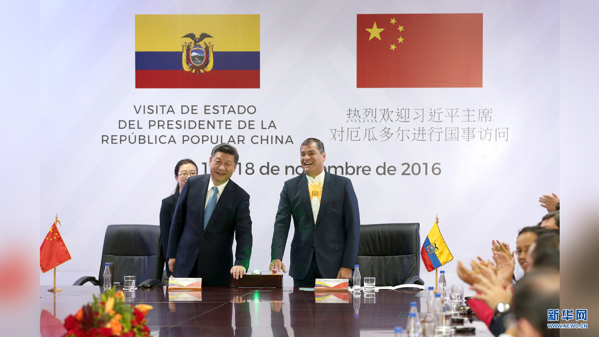 當地時間11月18日,國家主席習近平在基多同厄瓜多爾總統科雷亞共同出席中方援建的厄瓜多爾公共安全應急指揮中心聯合實驗室揭牌儀式,喬內醫院奠基、科卡科多-辛克雷水電站竣工發電視頻連線活動。這是兩國元首共同為厄瓜多爾公共安全應急指揮中心聯合實驗室揭牌。新華社記者 馬占成 攝2016-11-19