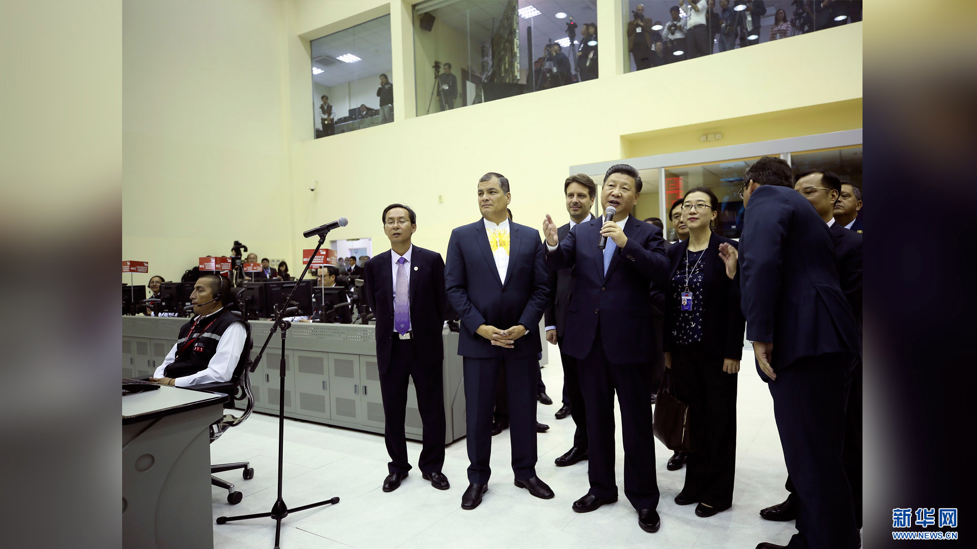 當地時間11月18日,國家主席習近平在基多同厄瓜多爾總統科雷亞共同出席中方援建的厄瓜多爾公共安全應急指揮中心聯合實驗室揭牌儀式,喬內醫院奠基、科卡科多-辛克雷水電站竣工發電視頻連線活動。這是習近平通過視頻連線向地震災區波多維耶霍指揮中心當地員工致以親切問候,向地震災害中獲救者表達慰問和祝福。新華社記者 蘭紅光 攝2016-11-19