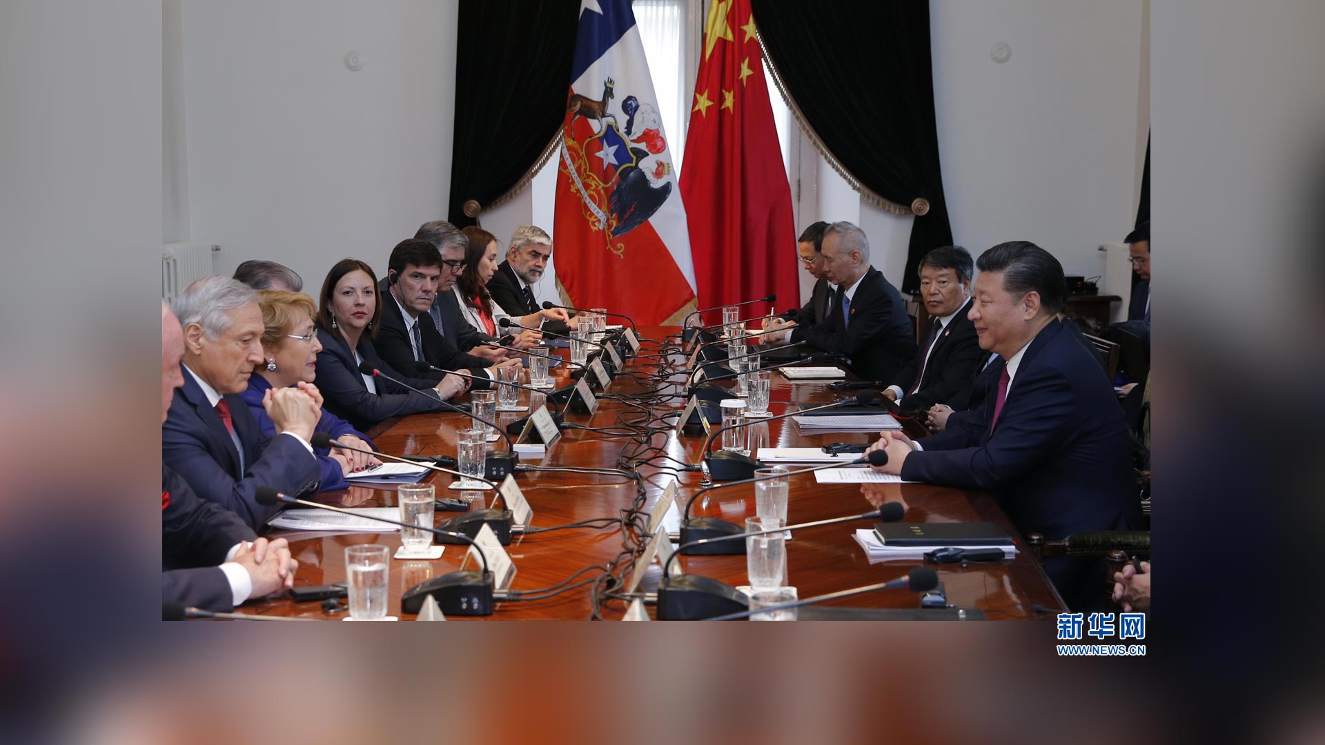 11月22日,國家主席習近平在圣地亞哥同智利總統巴切萊特舉行會談。 新華社記者 鞠鵬 攝2016-11-23