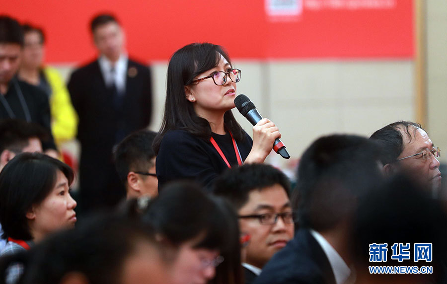 ??? 10月20日,十九大新聞中心舉辦集體采訪活動,主題為“文化發(fā)展開創(chuàng)新局面”。圖為中央人民廣播電臺記者提問。新華網 陳杰攝
