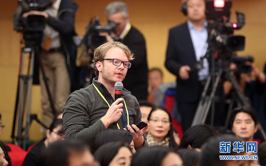 ??? 10月21日,十九大新聞中心舉辦記者招待會,邀請中共中央統(tǒng)戰(zhàn)部常務(wù)副部長張裔炯、副部長冉萬祥,中共中央對外聯(lián)絡(luò)部副部長郭業(yè)洲介紹黨的統(tǒng)一戰(zhàn)線工作和黨的對外交往情況,并回答記者提問。圖為彭博新聞社記者提問。新華網(wǎng) 郝廣鵬攝