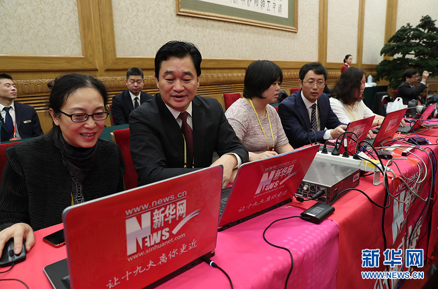 10月25日,黨的十九屆中央委員會第一次全體會議新選出的中央政治局常委將同中外記者見面。圖為新華網直播團隊在見面會現場準備直播。新華網 翟子赫 攝