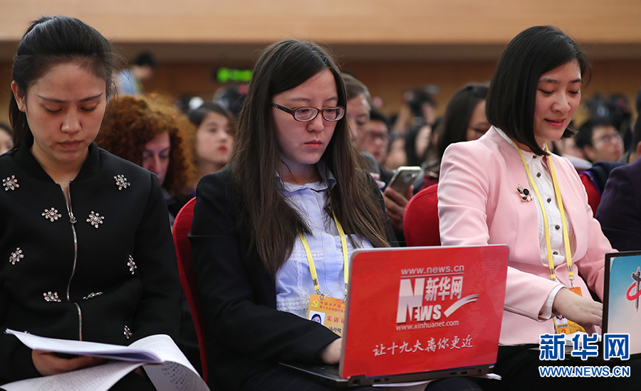 10月26日上午10:00,中國共產黨第十九次全國代表大會新聞發言人在梅地亞賓館二層新聞發布廳召開專題新聞發布會,請有關方面負責人解讀十九大報告,并回答記者關心的問題。圖為現場媒體記者。新華網?翟子赫 攝