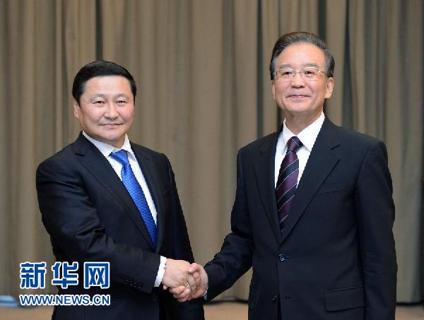 ??? 12月5日,國務院總理溫家寶在比什凱克會見蒙古國總理阿勒坦呼亞格。 新華社記者謝環馳攝