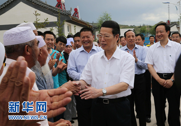 ??? 7月2日至5日,中共中央政治局常委、國務院副總理張高麗赴寧夏、甘肅調研。這是7月2日,張高麗來到寧夏固原市的一處移民新村,看望少數(shù)民族群眾,了解搬遷移民生活狀況。 新華社記者劉衛(wèi)兵攝