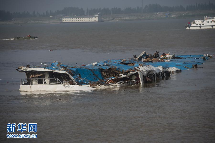 新華網快訊:5日9時05分,長江“東方之星”完全扶正,但仍沉沒在水中,只露出藍色船頂。