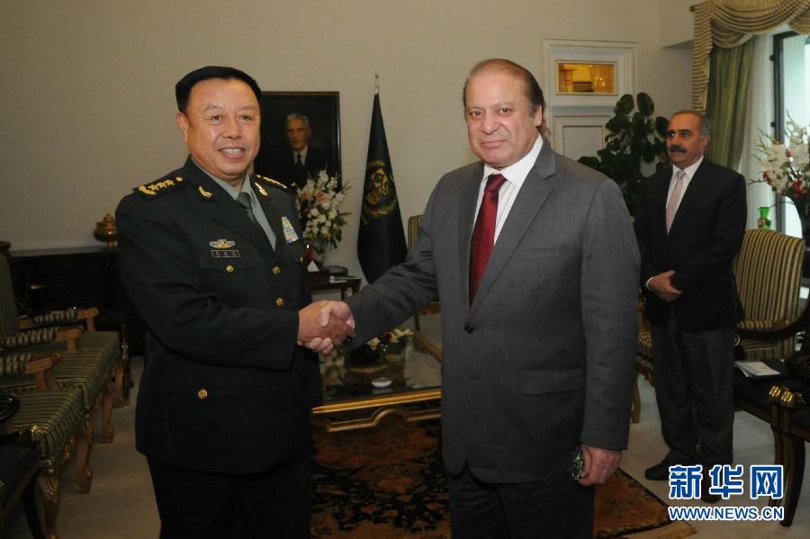 ???? 11月12日,在巴基斯坦首都伊斯蘭堡,中央軍委副主席范長龍(左)與巴基斯坦總理謝里夫握手。正在巴基斯坦訪問的中央軍委副主席范長龍12日會見了巴總理謝里夫。 新華社發(艾哈邁德·卡邁勒攝)