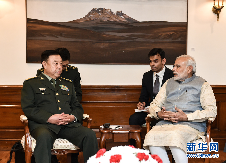 ??? 11月17日,正在印度訪問的中央軍委副主席范長(zhǎng)龍(前左)在新德里會(huì)見印度總理莫迪(前右)。 新華社發(fā)