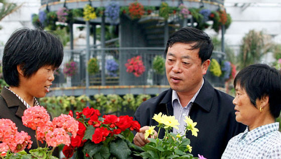 武繼軍(中)和花農交流花卉培育經驗。