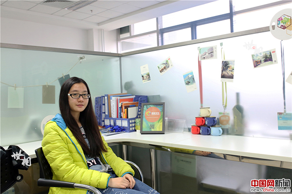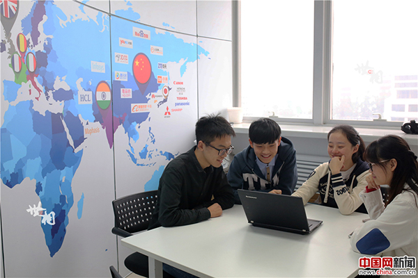 蜂巢創意空間的創業團隊在討論方案,墻面上貼滿了全世界有名的企業。
