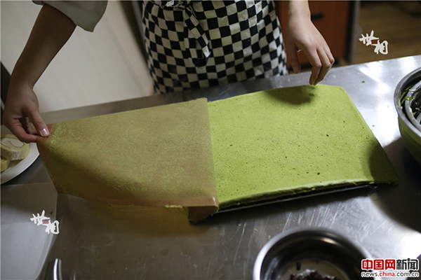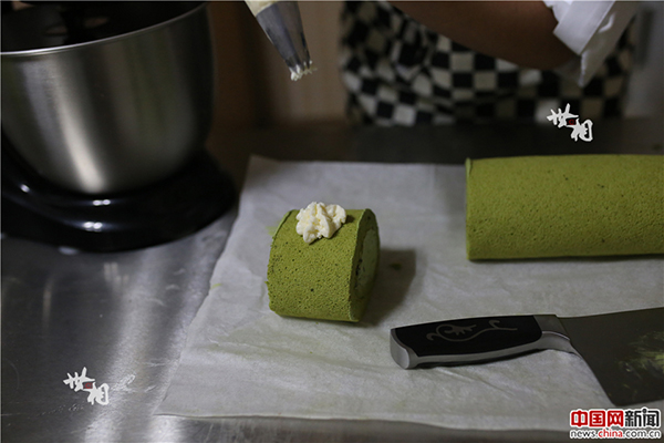 涂抹好奶油卷起來后,再加一些小裝飾,陳騫自創的宇治抹茶紅豆蛋糕卷就做成了。