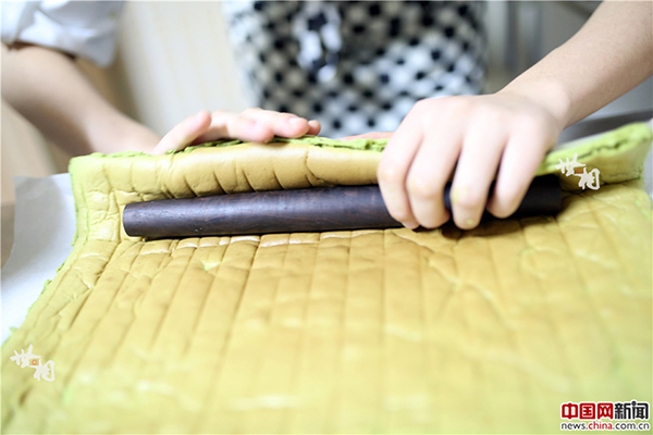 陳騫要求每一道工序都要精心制作,這樣蛋糕才能達到理想中的口味。圖為陳騫用篩子將綠茶粉均勻撒入甜點原料中。