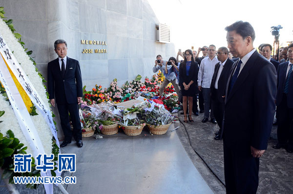當天上午,李源潮前往何塞·馬蒂紀念館,代習近平主席向菲德爾·卡斯特羅敬獻花圈,并向在場的菲德爾·卡斯特羅的家屬轉達習近平主席的深切慰問。