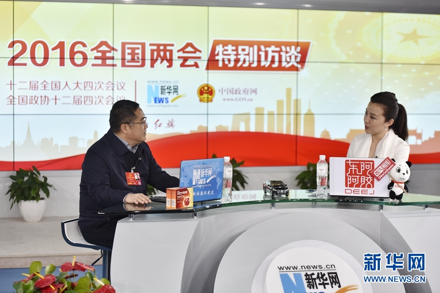 2016年3月12日,全國人大代表、正邦集團董事局主席、總裁林印孫做客新華網兩會訪談直播間。圖為訪談進行時。新華網 郭小天 攝
