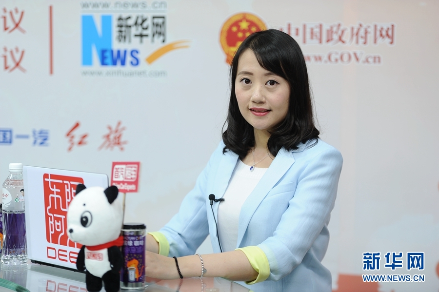 2016年3月14日,全國人大代表、湖南省益陽市委書記胡忠雄做客新華網兩會訪談直播間。圖為新華網主持人李由。新華網 盧志佳 攝