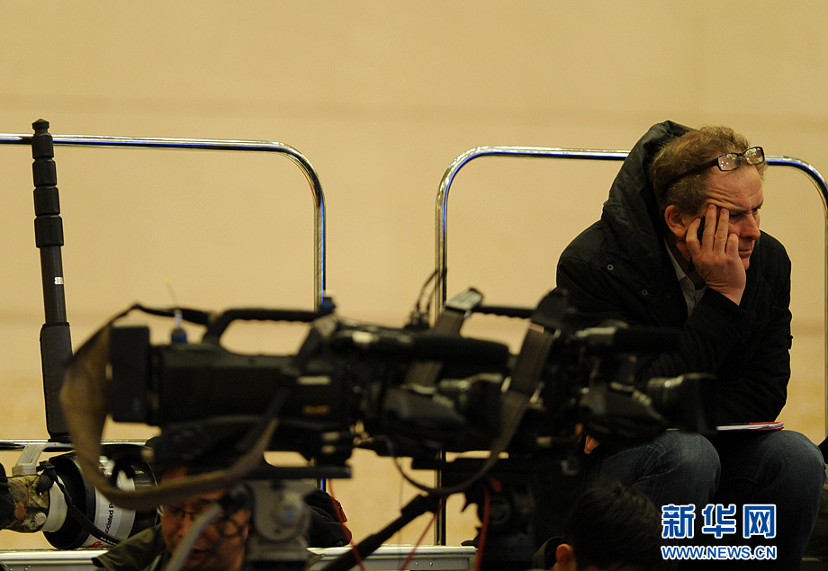 3月16日上午,國務院總理李克強在人民大會堂三樓金色大廳會見采訪十二屆全國人大四次會議的中外記者并回答記者提出的問題。圖為早早趕到記者會現場的各路媒體記者。新華網/中國政府網 陳競超 攝