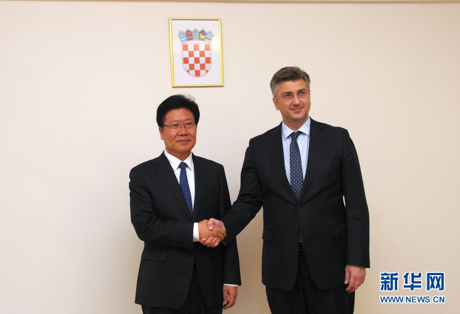 ??? 4月10日,克羅地亞民主共同體主席、政府總理普連科維奇(右)在薩格勒布會見中共中央政治局委員、中央黨的建設工作領導小組副組長張春賢。新華社記者薛群攝