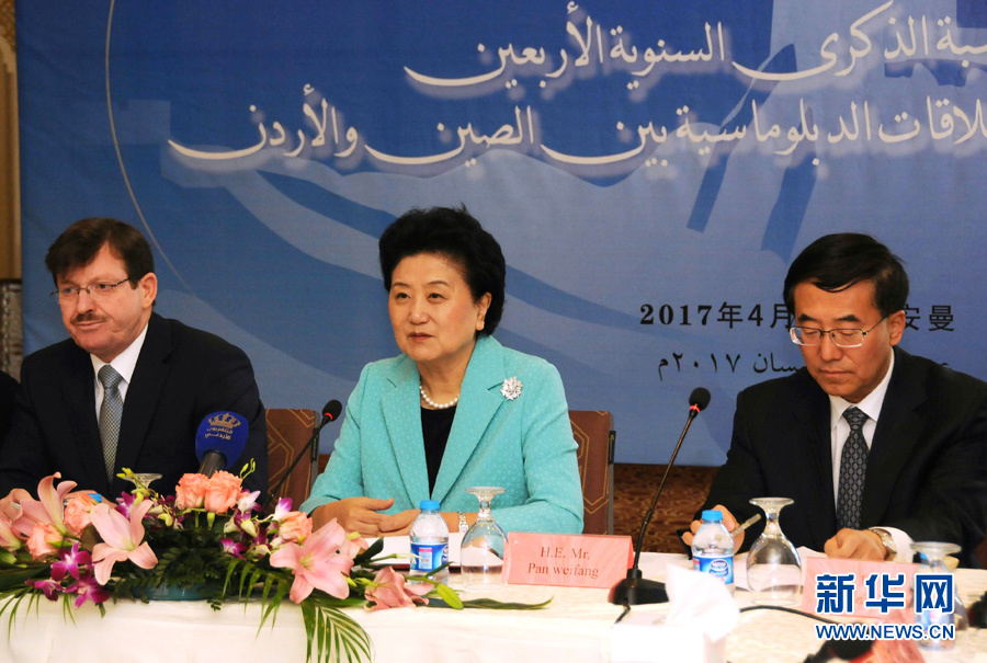 4月20日,正在對約旦進行正式訪問的中國國務院副總理劉延東(中)在安曼出席中約建交40周年座談會。 新華社記者林曉蔚攝