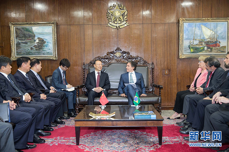 7月11日,在巴西首都巴西利亞,中共中央書記處書記、全國政協副主席杜青林(中左)會見巴西參議院議長歐尼西奧·奧利維拉(中右)。新華社記者李明攝