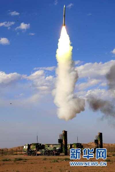 空軍地空導彈兵第二營在執行“藍盾”演習任務中進行實彈發射(2016年7月14日攝)。新華社發