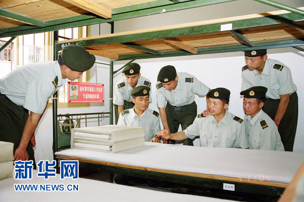 戰(zhàn)士們在李向群的床鋪前重溫英雄的故事(資料圖片)。新華社發(fā)