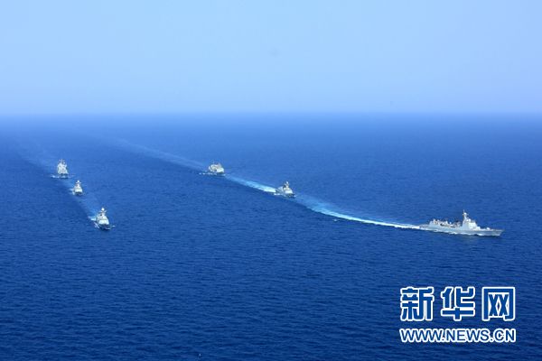 圓滿完成亞丁灣、索馬里海域護航任務的中國海軍第二十批護航編隊(右)與第二十一批護航編隊分航,駛離亞丁灣海域開始執行環球訪問任務(2015年8月23日攝)。新華社發(曾濤 攝)