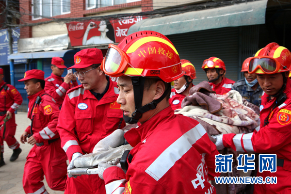 在尼泊爾首都加德滿都,中國國際救援隊搜救隊員從因地震坍塌的樓房中抬出一名幸存者(2015年4月26日攝)。新華社記者 白陽 攝