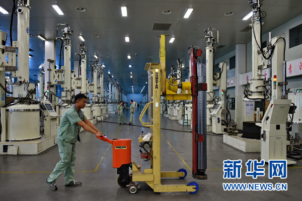 山西潞安集團太陽能科技有限責任公司的工人在搬運剛剛生產出的單晶硅棒(7月20日攝)。新華社記者 曹陽 攝