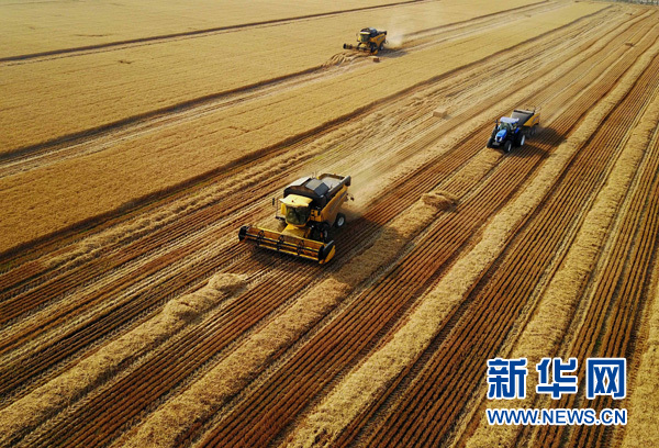 在河南??h中鶴現代農業示范園區的麥田里,收割機在收獲小麥(6月7日攝)。新華社記者 李安 攝
