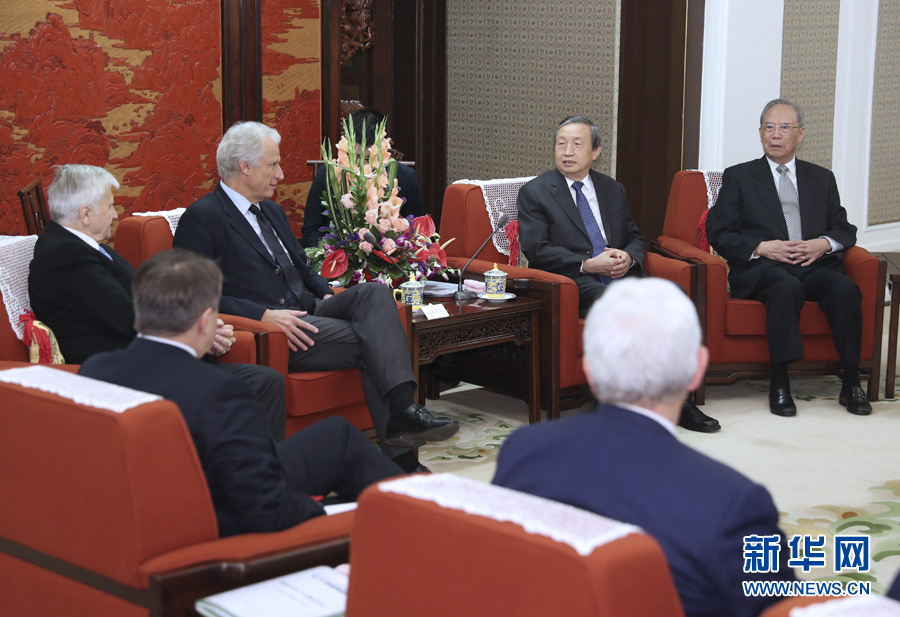 9月22日,國務院副總理馬凱在北京中南海紫光閣會見法國前總理多米尼克·德維爾潘等參加首屆中國-歐盟工商領袖和前高官對話的歐方代表。新華社記者馬占成攝