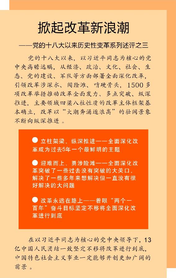 5年來,黨中央以“咬定青山不放松”的精神將各項改革任務全面推開,使改革大潮席卷神州大地。