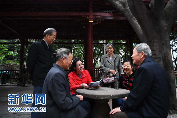 10月10日,重慶市南岸區(qū)南坪街道南湖社區(qū)黨委書(shū)記張琦(左三)和社區(qū)居民一起聊家常。 新華社記者 王全超 攝