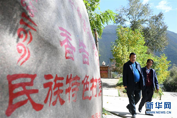 10月12日,甘肅甘南藏族自治州夏河縣曲奧鄉香告村村支書鬧日加(左)和村民邊走邊談。新華社記者 陳斌 攝