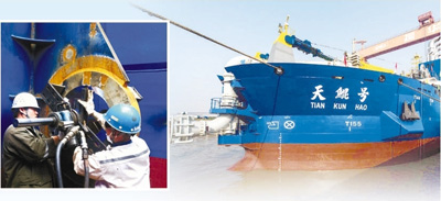 “船上鋼樁臺(tái)車安裝了4個(gè)大油缸,單個(gè)就達(dá)38噸,所有安裝誤差都只有0.2毫米”,安裝輪機(jī)車間主任沙勝紅說(shuō),“考驗(yàn)還在繼續(xù)”。輪機(jī)車間的工人全部是訓(xùn)練有素的技術(shù)員工,他們克服了難以想象的困難,硬是拿下全船高難度的設(shè)備安裝工作,質(zhì)量贏得船東、船檢的一致好評(píng)。