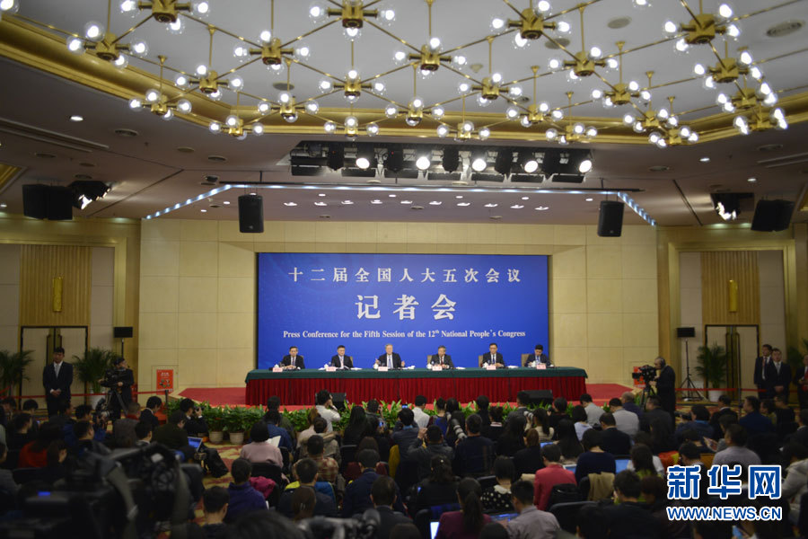 3月10日,十二屆全國人大五次會議新聞中心舉行記者會,邀請中國人民銀行行長周小川、副行長易綱、副行長兼國家外匯管理局局長潘功勝、副行長范一飛就“金融改革與發展”的相關問題回答中外記者的提問。圖為記者會現場。新華網/中國政府網 孫韜 攝